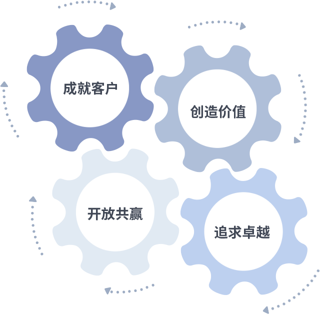 成就客户是一切决策的出发点,,,,创造价值是衡量所有工作的标准,,,追求卓越是我们做事做人的态度,,,开放共赢是我们的格局也是最终的结果。。价值观的齿轮环环相扣,,,,推动着组织里的每个人不断向前。。。