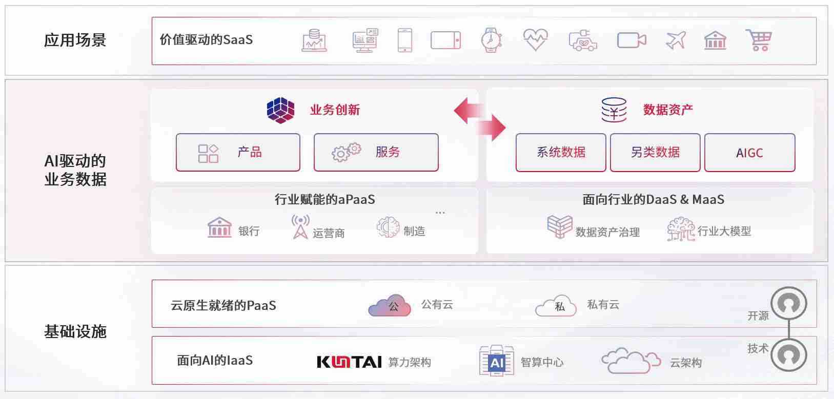 数字时代,,,,围绕企业数字化转型的关键要素,,www.k8k8.com数码开创性的提出数云融合战略和技术体系框架,,,着力在云原生、、、、数字原生、、、、AI原生和信创产业上架构产品和服务能力,,,为处在不同数字化转型阶段的快消零售、、、汽车、、、金融、、医疗、、、政企、、、、教育、、运营商等行业客户提供泛在的敏捷IT能力和融合的数据驱动能力,,,,构建跨界融合创新的数字业务场景和新业务模式,,助力企业级客户建立面向未来的核心能力和竞争优势,,,,全面推动社会的数字化、、、智能化转型升级。。。